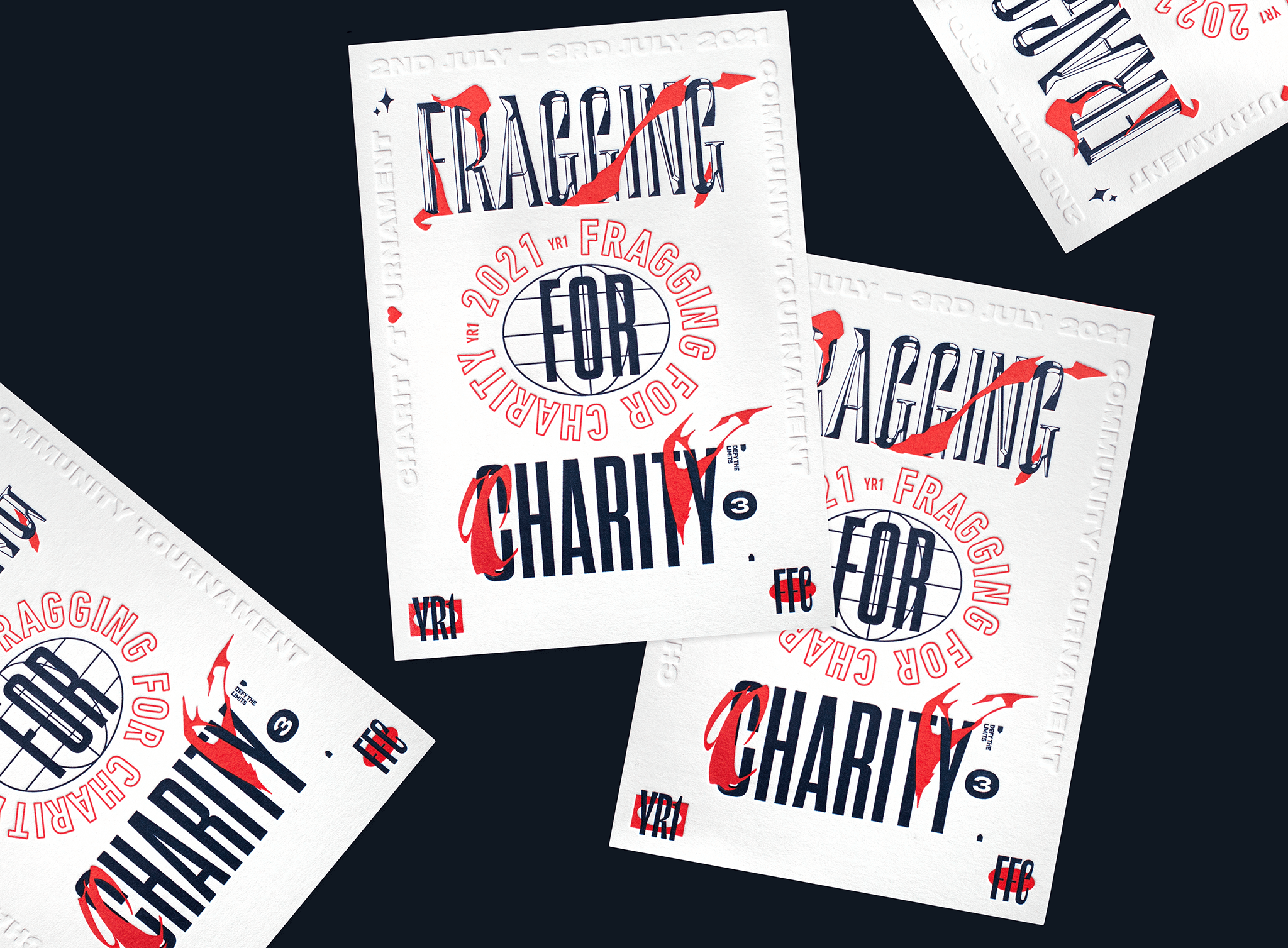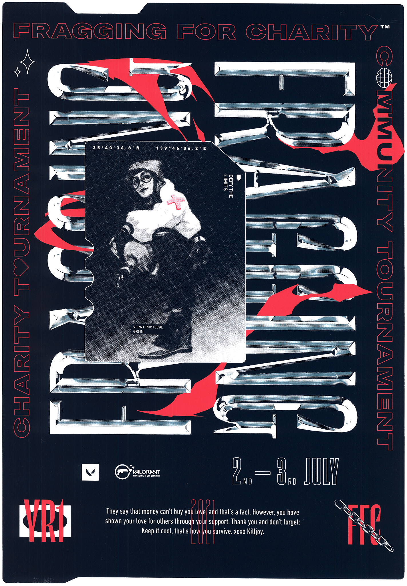 Promotion für das jährliche Valorant-Benefizturnier »Fragging for Charity 3.0«. 16 Influencer*innen, 50.000€ für einen guten Zweck. 2. und 3. Juli live auf Twitch! Für das Keyvisual haben wir Elemente aus bekannte Valorant Charakter illustrationen extrahiert und in die Typografie integriert. Der von uns animierte Teaser Trailer für die sozialen Medien hat auf den Kanälen von Riot Games für die nötige Reichweite für das beliebe Streaming Event gesorgt. Jeder Content Creator hat zusätzlich ein aufwändig gestaltetes Merchandise Paket mit limitierten Kunstdrucken zum Eventstart erhalten. Watch Event Recap
