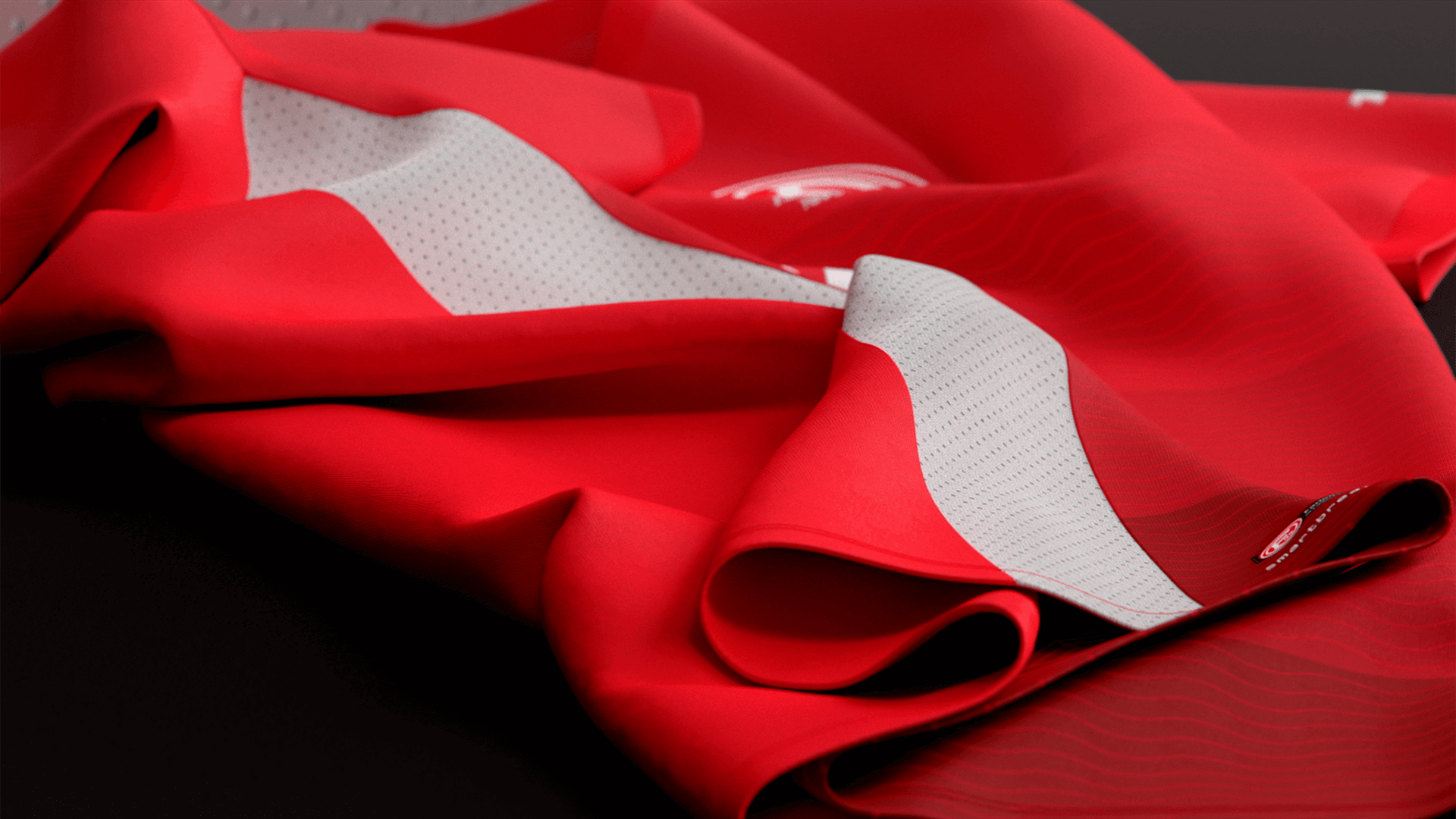 After dark, numerous fans had gathered at the legendary Fortuna booth to watch the jersey launch live. The new shirt was launched by projecting a video onto the facade of the building across the street. The away jersey for the upcoming 2019/20 Bundesliga season is based on the Fortuna DNA core value »Heimate«. Various shades of red – from light to dark – form the basic color of the jersey. Inspired by the Rhine and its bridges, the red bars feature wave-like shapes as well as stylized representations of the seven Rhine bridges. Every seasonal jersey features a 125th anniversary embroidery below the club crest. A modern interpretation of the city crest can be found on the collar, as well as a map of Düsseldorf with the words »Heimat« on the inside. The white mesh inserts under the arms complete the design.
