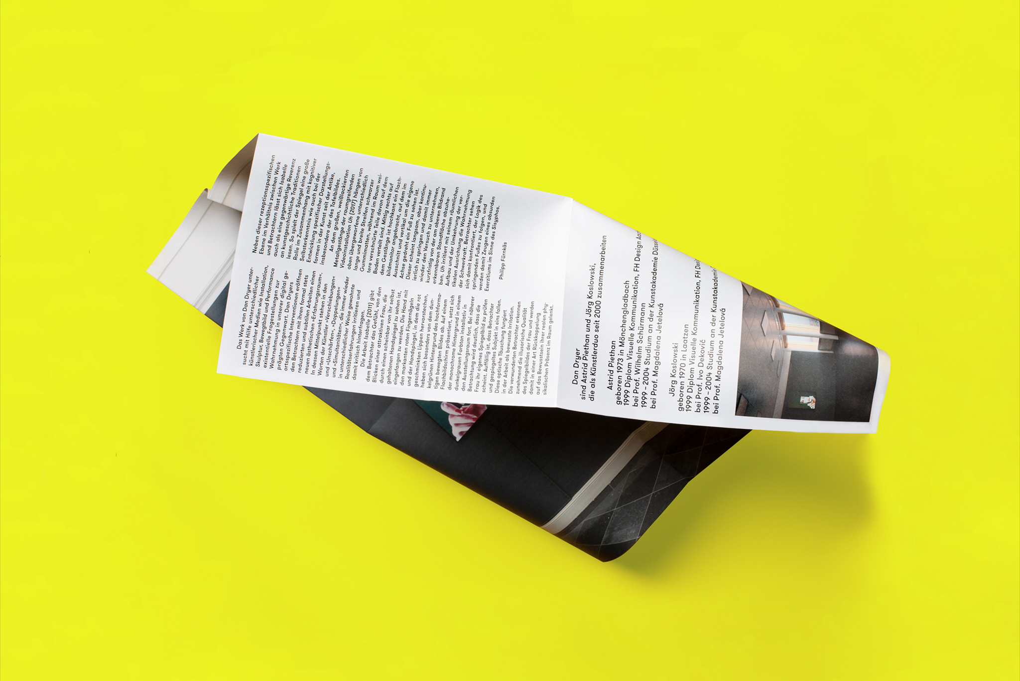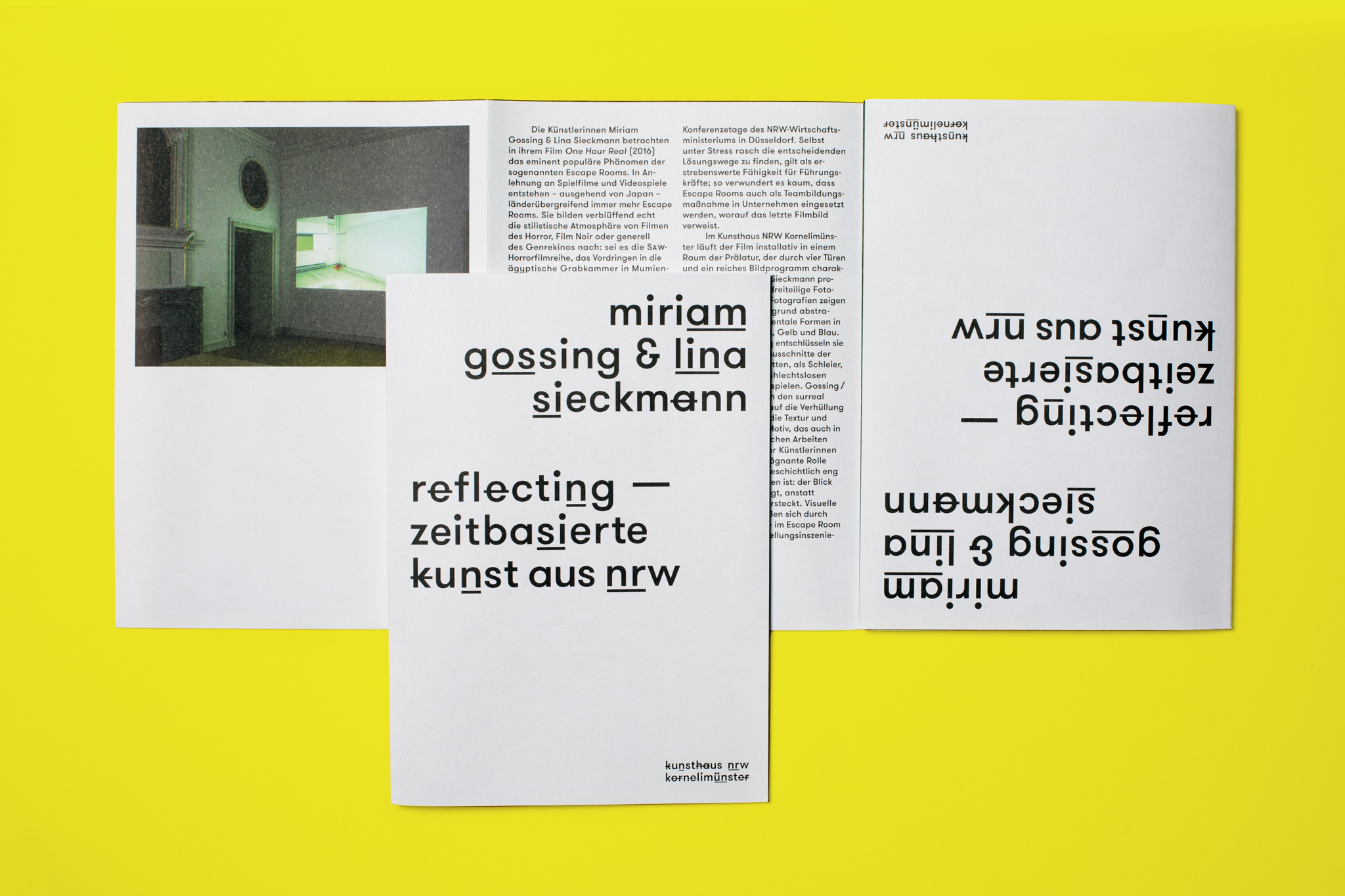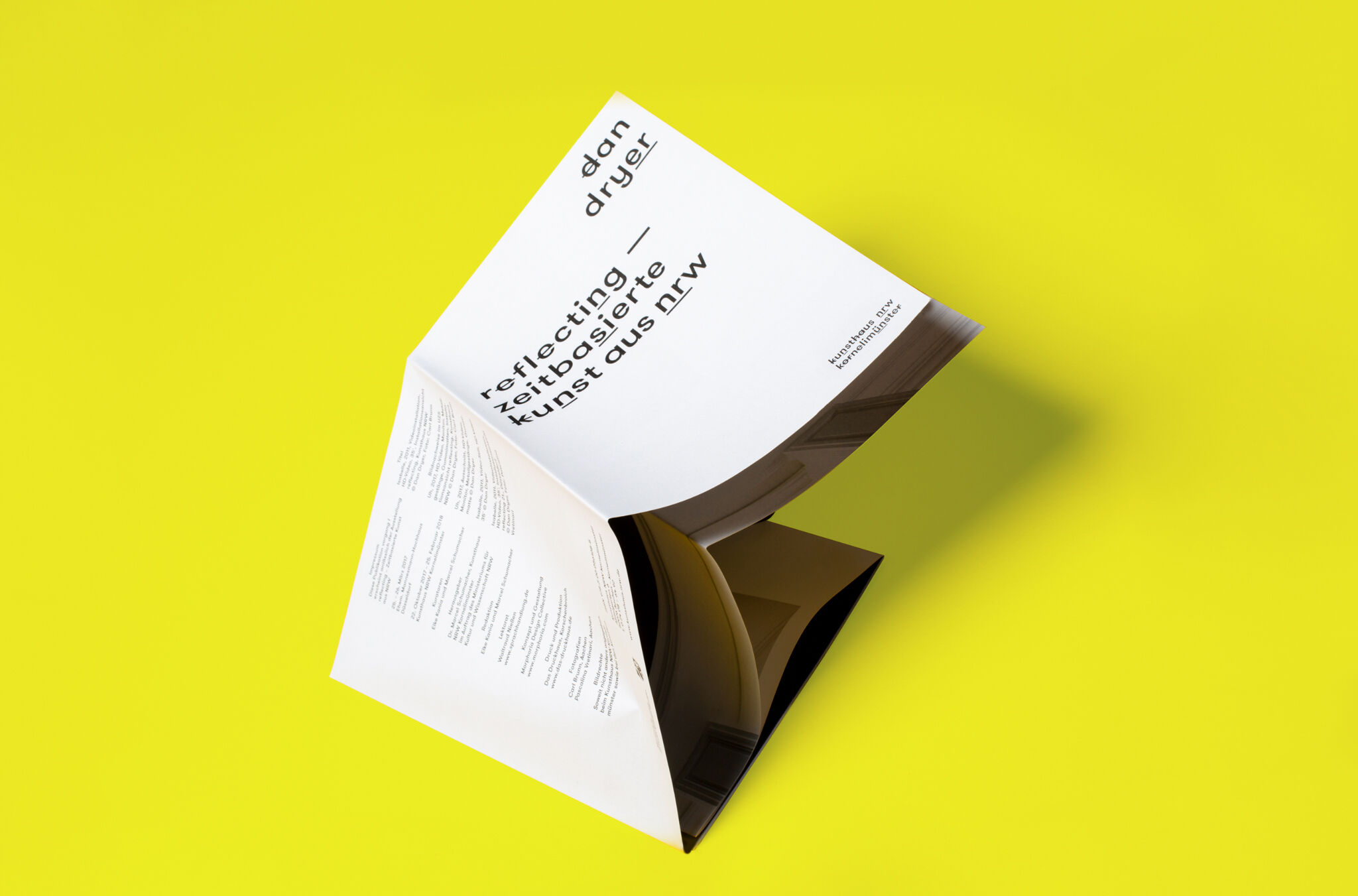 Concept and design of a poster catalog for Kunsthaus NRW. The new publication series »vorgang« shows a spectrum of contemporary art from North Rhine-Westphalia. The underlying exhibition »reflecting« combines sculpture, film, video and sound installations and analog slide projection by eight artists. Each poster visualizes a space – the images of the installations are complemented by explanatory texts and are held together in a slipcase.