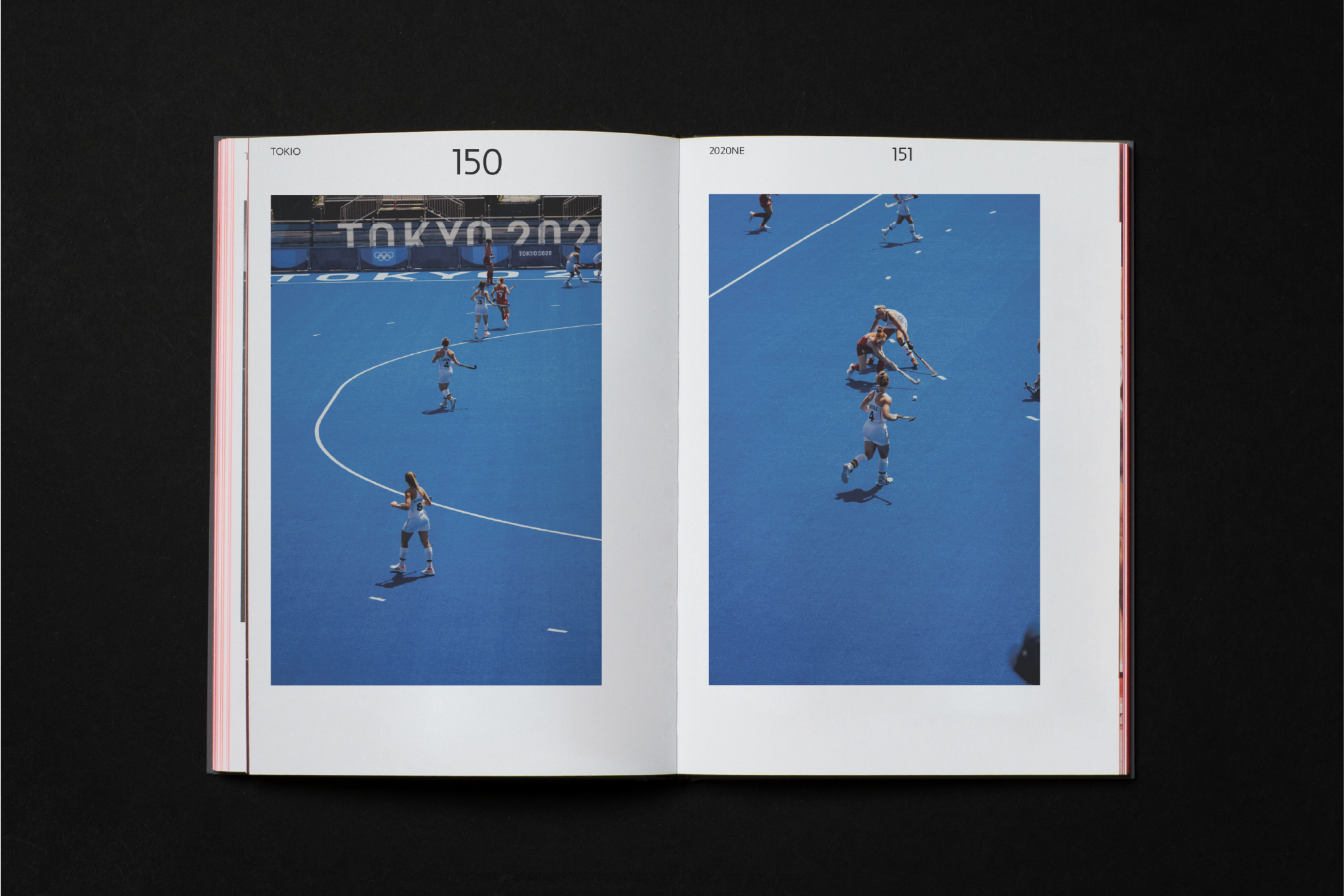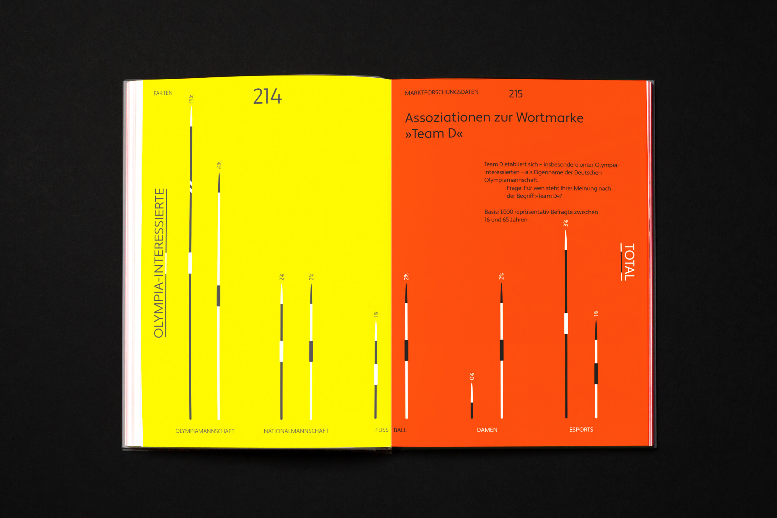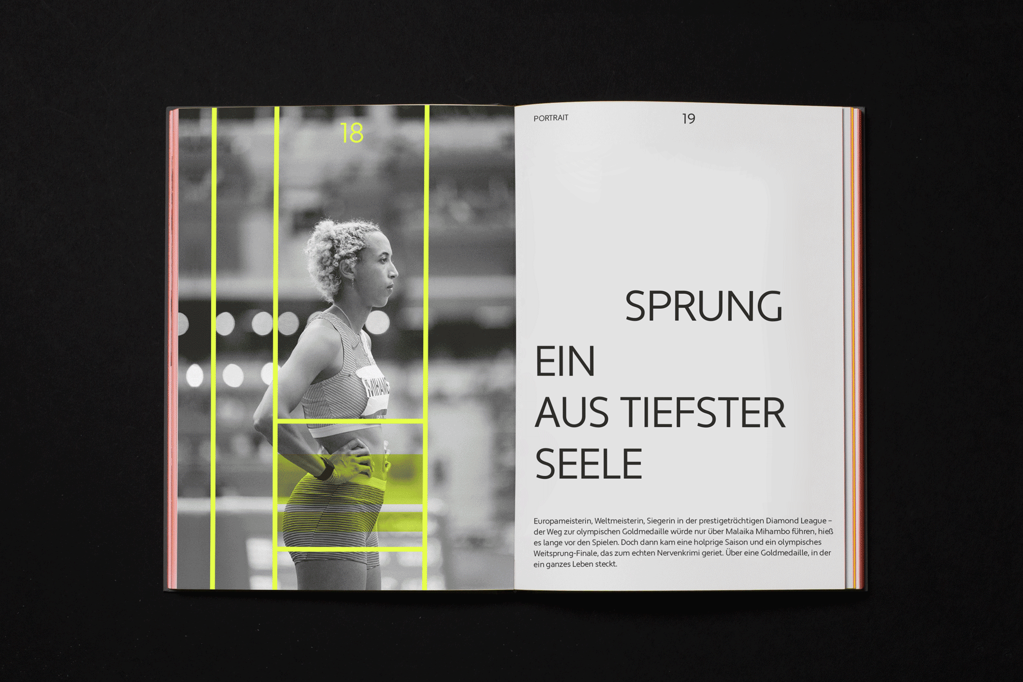 Elaborate finishes create a visual and tactile association with sports. We also used a modern interpretation of the colors black, red and gold, but we made it pop. The use of intense spot colors gives the book vibrant graphics that extend outward to the cover. Readers are surprised by the haptic properties of the paper cover, which contains recycled plastic and is thus reminiscent of typical sports textures.